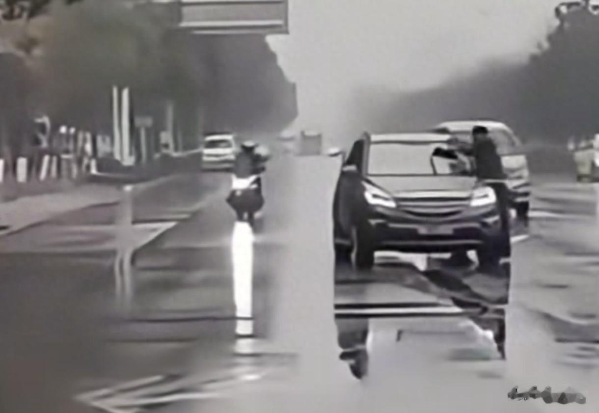 突然两轮车行驶到suv前面,将车横放别停suv后,男子下车捡起一块石头,朝着车子走去。