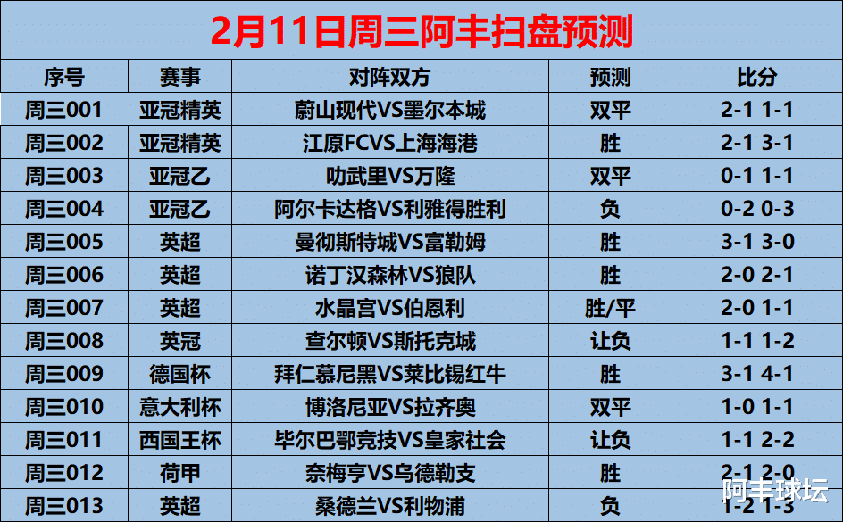 2/11周三赛事前瞻:英超 诺丁汉森林VS狼队(内附13场预测)