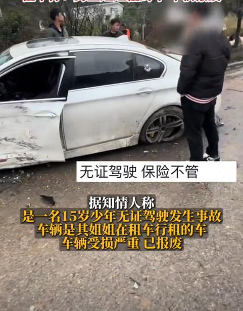 近日,网传15岁少年无证驾驶租用的车辆发生事故,车辆受损严重。