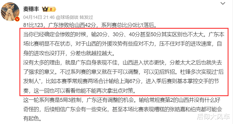 不妨来看看赛后媒体人麦穗丰的说法,输球赛后,麦记者认为:广东队本场比赛状态不佳,难以限制山西队外援的进攻火力,随着比赛深入,分差越来越大,已经确定了要吃下惨败,分差太大之后也就失去了强追的意义,不如提前投子认负,好好思考下一轮系列赛的对策。