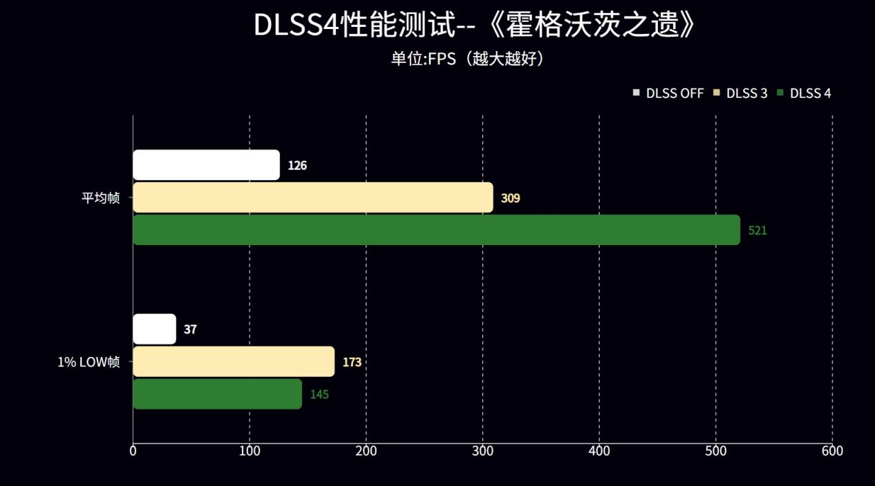 接着测试了《霍格沃茨之遗》,4K分辨率+光追超高画质设定,126帧 VS 521帧,这就是关和开DLSS 4的区别。309帧 VS 521帧,这则是DLSS 3 VS DLSS 4的区别,多帧生成技术可不是虚的。
