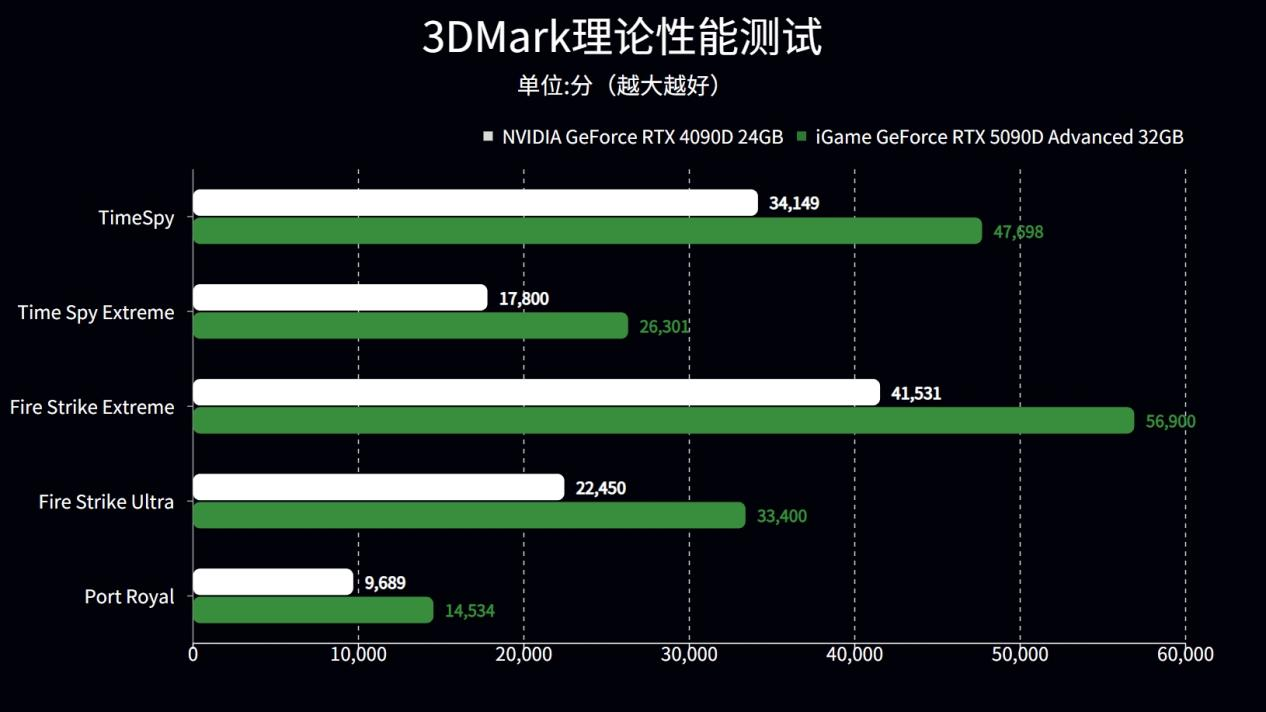 基于DX12的TimeSpy和Time Spy Extreme测试中,RTX 5090D显卡领先上一代的 RTX 4090D显卡达到了40%以上。而基于DX11的Fire Strike Extreme、Fire Strike Ultra测试中,领先超过37%及50%。
