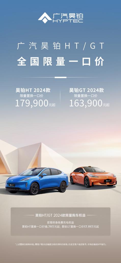 广汽昊铂对于豪华品牌的高端化诠释,以「高价值」的技术加速产品推新,赋能豪华带来体验革新的同时,更以「高品价比」的产品策略让用户买得放心、坐得舒心、用得省心。广汽昊铂HT/GT 2024款同步推出限量一口价政策,昊铂HT 2024款限量置换一口价最低17.99万元起;昊铂GT 2024款限量置换一口价最低16.39万元起。