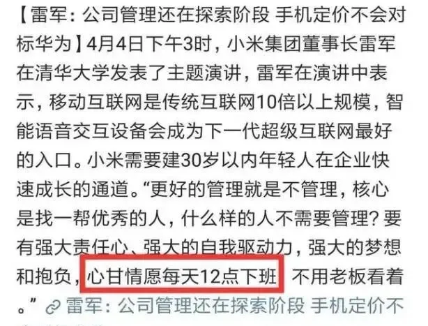 而早在2019年的时候,雷军在清华大学进行的一次主题为“小米9年:创新、变革与未来”的演讲就曾提出:“什么样的人不需要管理?有强大责任心、强大的自我驱动力,强大的梦想和抱负,心甘情愿每天12点下班,不用老板看着。”