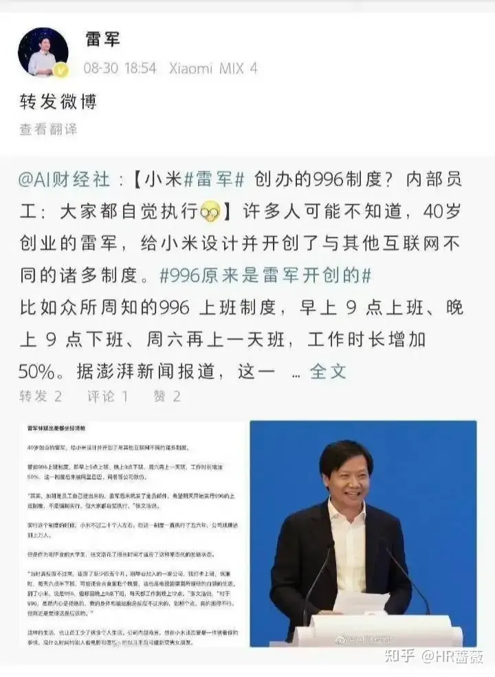 近日,有脉脉用户发帖称,小米要求员工日均工时不低于11.5小时,其中低于8小时需要提交说明,工时排名靠后的要被约谈,甚至劝退。“小米被曝要求员工日均工时不低于11.5小时”话题冲上热搜。