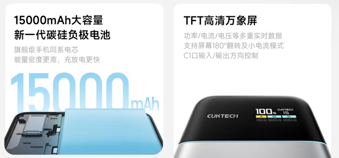 它,拥有 15000mAh 大容量(额定容量 8800mAh,额定能量 57.75Wh)。