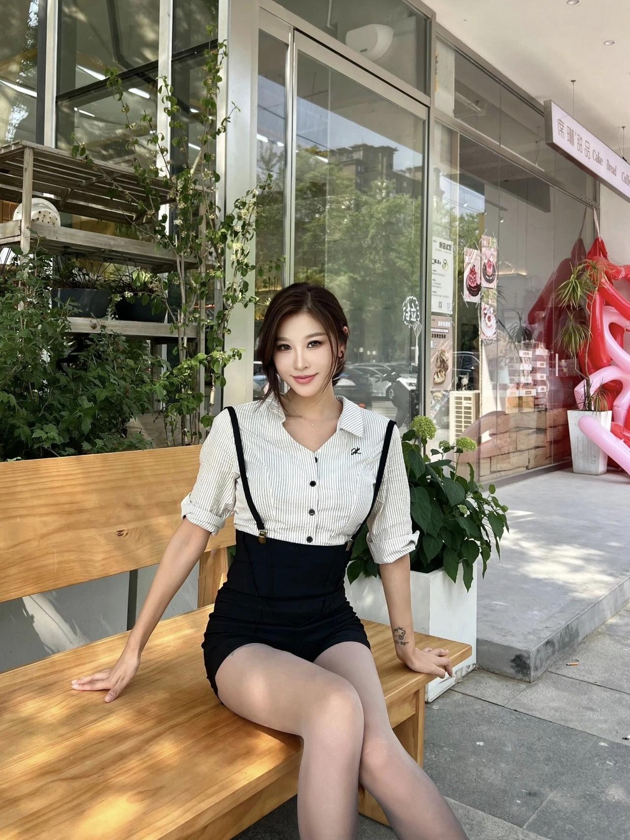 都市街头时尚女郎,优雅姿态,黑白配高跟鞋,尽显都市风范。