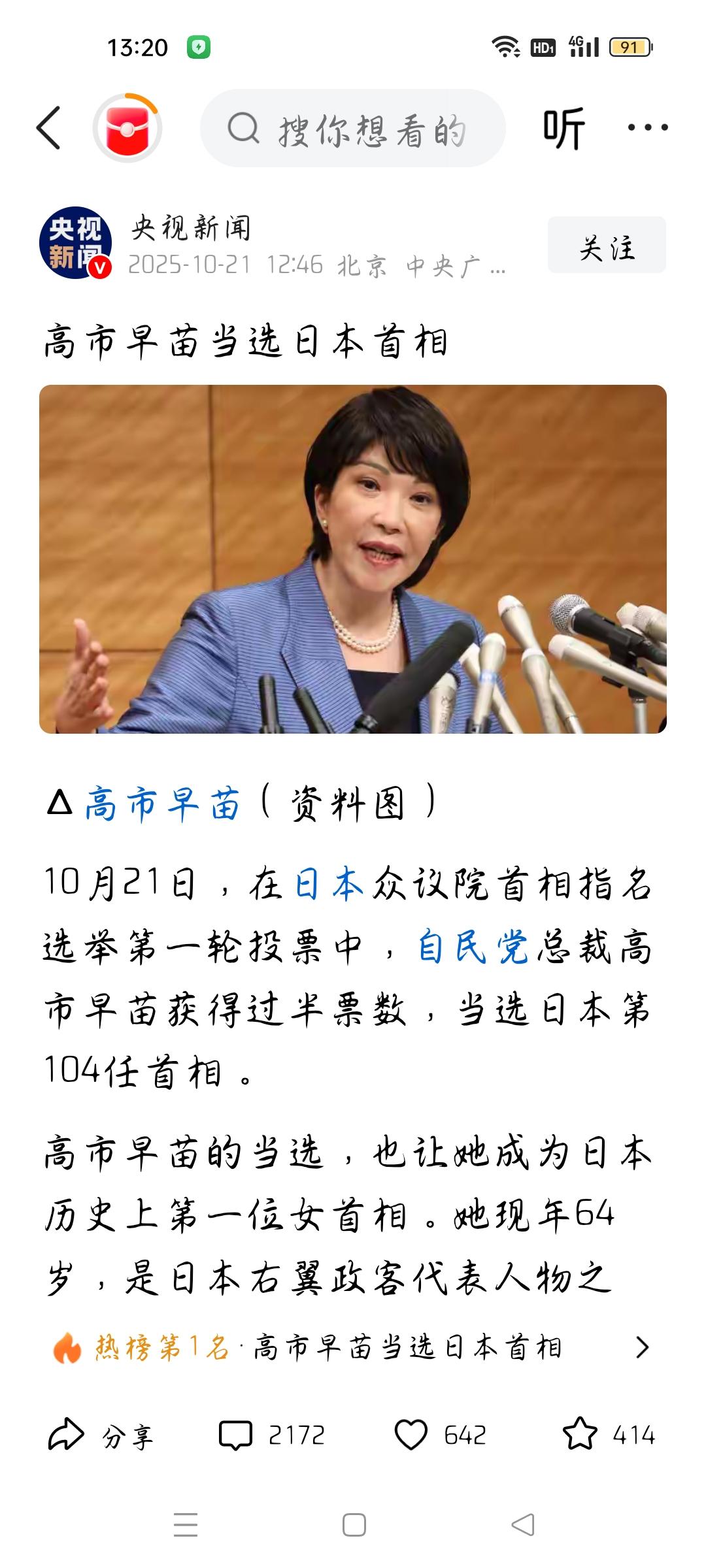 高市早苗当选日本首相,我想说 据央视新闻报道,10月21日,在众议院首相指名选举