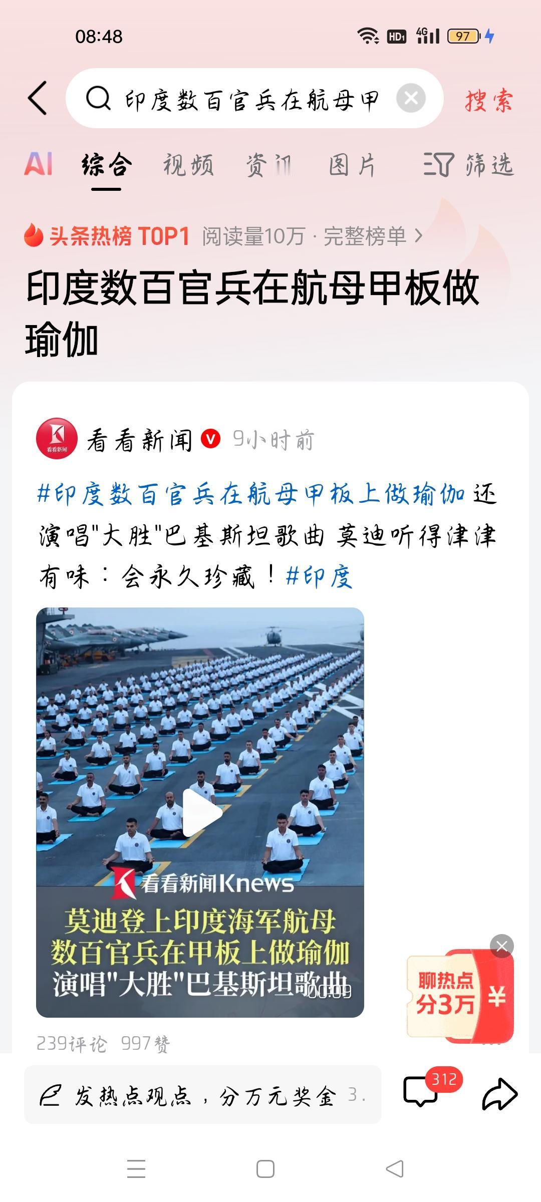 印度数百官兵在航母甲板做瑜伽,我想说 据看看新闻报道,印度数百官兵在航母甲板做瑜