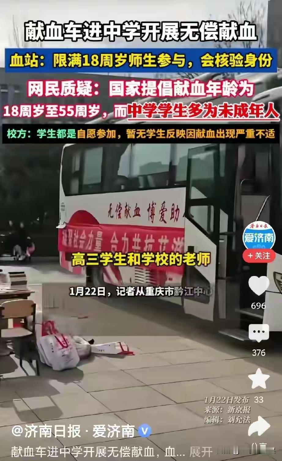 近日,重庆彭水县数所中学有献血车进校,举办师生无偿献血活动引发关注。有网民质疑,