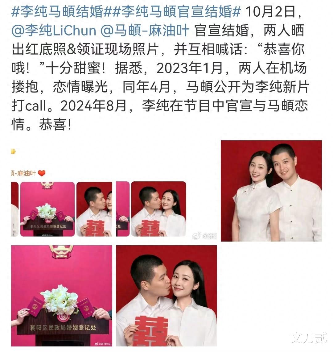 10月2日,马頔和李纯在微博大秀恩爱晒出了结婚证,一脸甜蜜羡煞旁人。