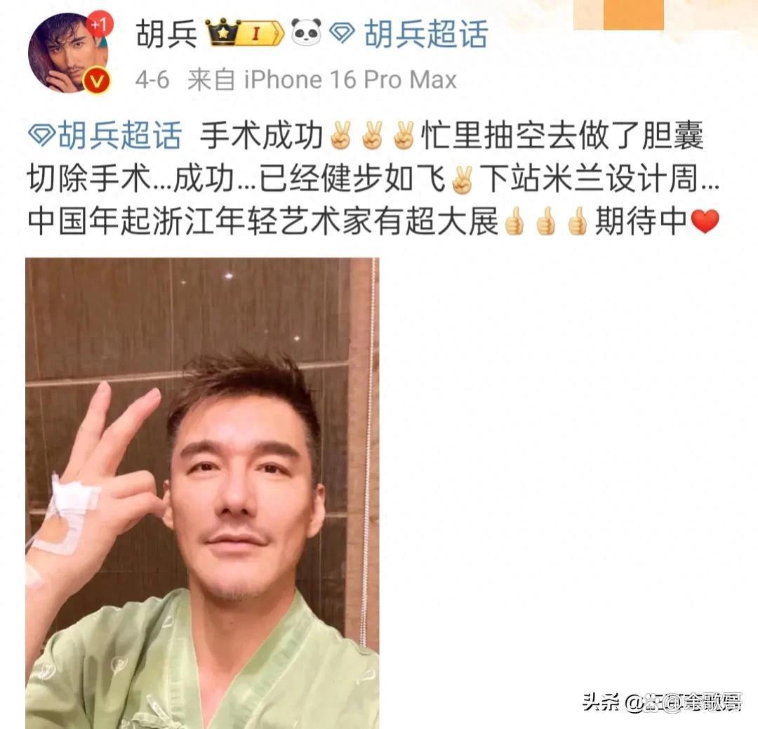 4月12日,胡兵在社交平台大方公开了手术细节。起初晒出的那张病床上的照片,即便口罩遮住大半脸庞,仍难掩憔悴。可他开口第一句,却是安抚大家,告知一切正常,这般乐观积极的态度,着实让人竖起大拇指。