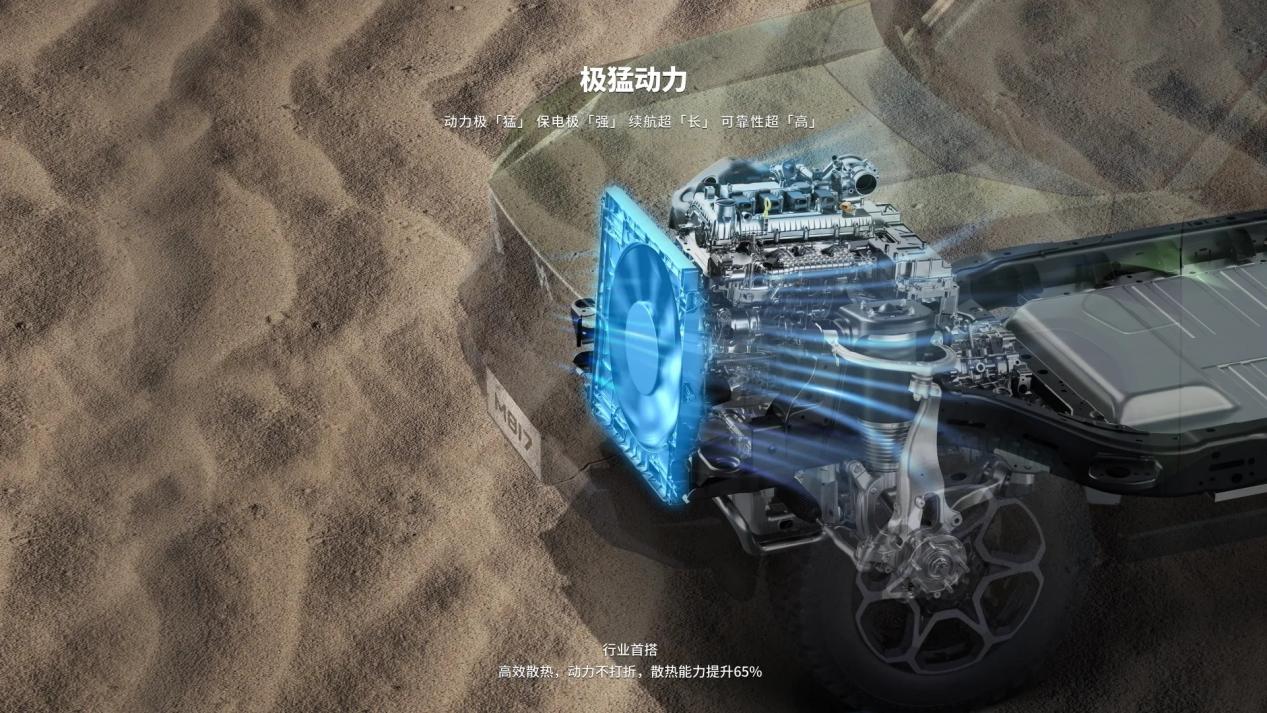 更关键的是,其持续输出功率突破300kW,较行业平均提升60%。这意味着在海拔5000米的盘山公路连续攀爬时,或夏季沙漠中反复冲坡涮锅,动力系统仍能保持稳定,避免因过热导致的“开锅”风险。这一表现得益于行业首创的3kW高压风扇散热方案,机舱散热能力提升65%,极端工况下仍游刃有余。