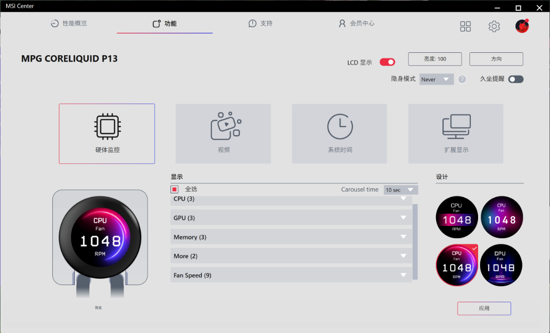 搭配上微星MSI Center控制中心中的水冷功能控制模块,可以让水冷屏幕上实时显示时间、CPU、内存等硬件的状态信息,也可以通过导入视频/图片文件或粘贴YouTube/BIliBili视频网站链接,自动识别视频文件,让冷头显示视频或图片文件。同时,屏幕也可以作为一块拓展副屏,将桌面显示的内容拖动到水冷屏幕上。