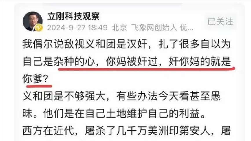 其一、“我偶尔说敌视义和团是汉奸,扎了很多自以为自己是杂种的心,你妈被奸过,奸你妈的就是你爹?……”