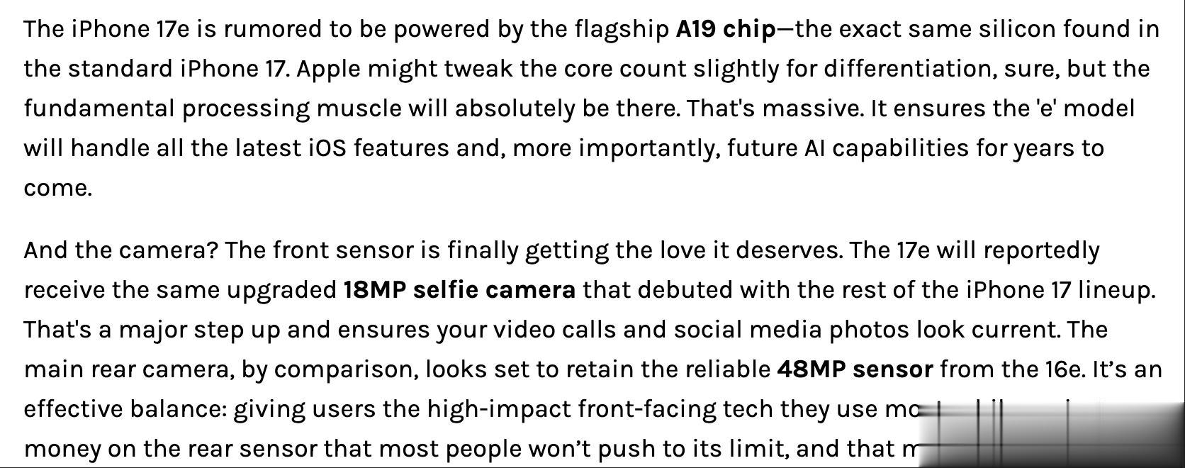虽然屏幕摆烂,但核心硬件不糊弄。消息显示 iPhone 17e 会搭载 A19 芯片,也就是跟 iPhone 17 一样的级别。即便有小幅调整,它的性能一定足够用很多年。对入门款来说,这算是最有价值的地方。