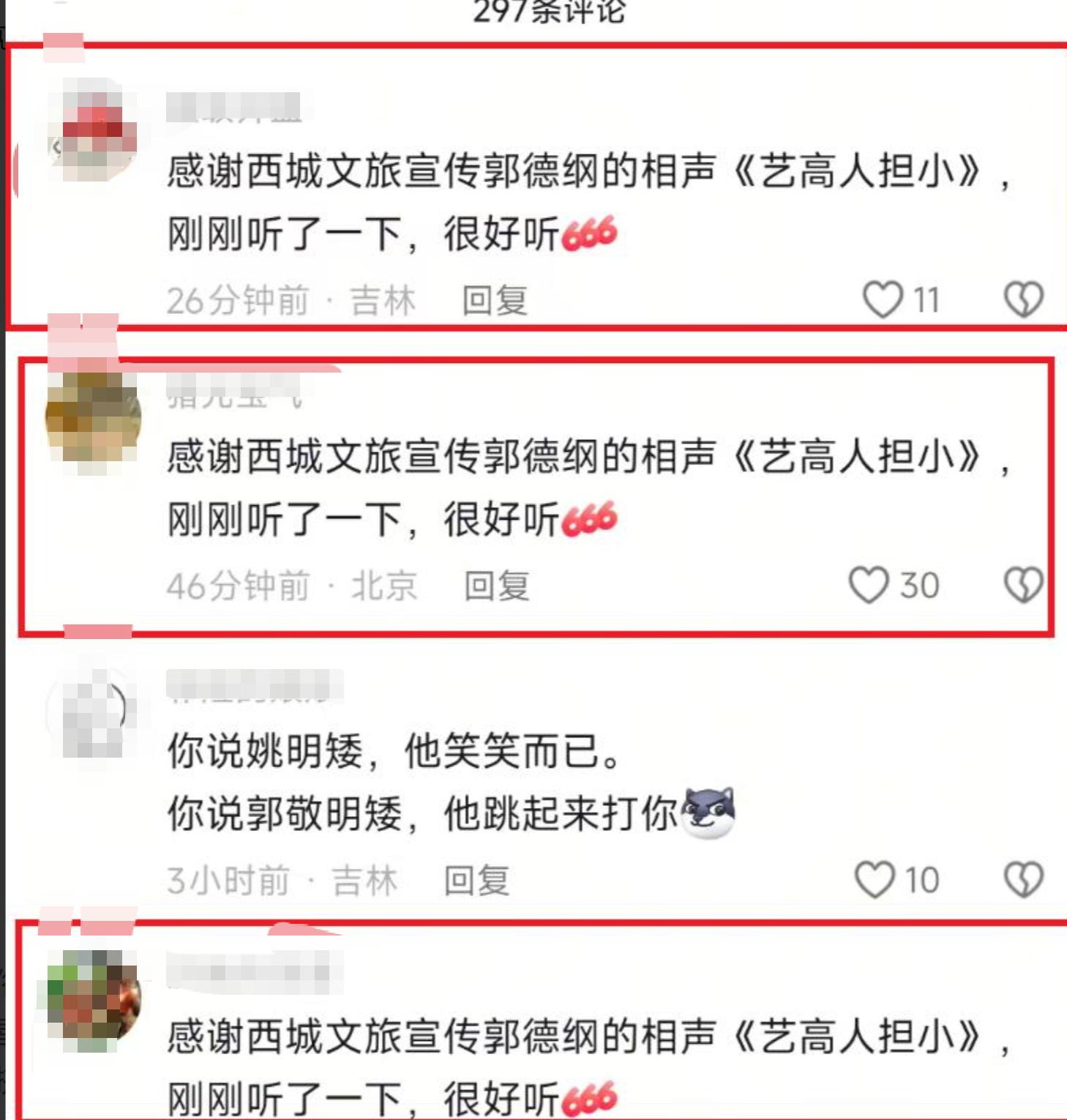 另一方面,部分粉丝在文旅局官方账号评论区集体留言,称“感谢宣传《艺高人胆小》,刚听完很好听”,并将“胆”故意写成“担”,形成统一话术。