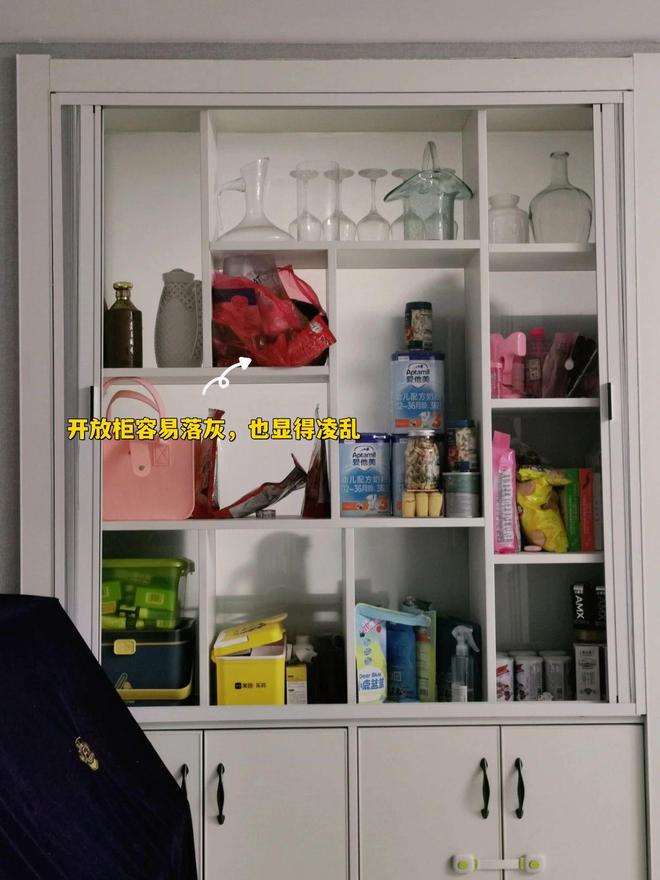 1、开放格:千万别被样板间里的开放格柜子“欺骗”了,家里做这种柜子只会增加你的家务量,没有柜门导致柜格上很容易落灰,隔几天就要擦一次灰,很累人的。