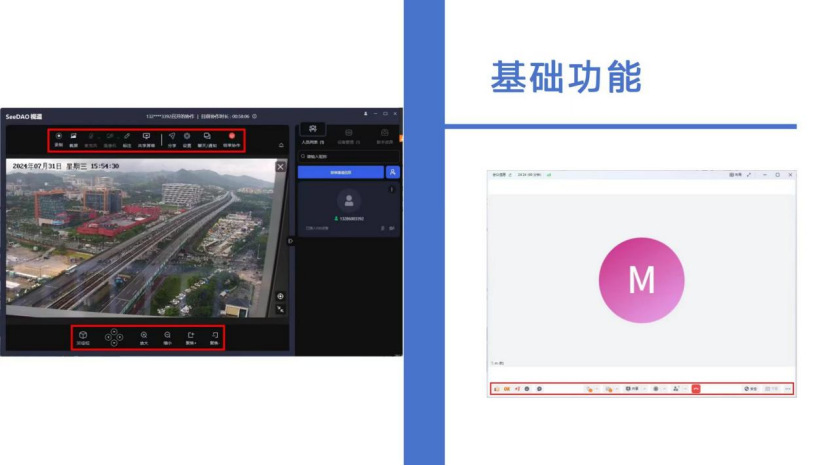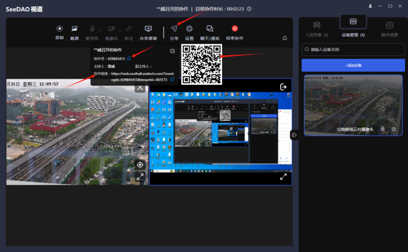 视道的会议界面则更加丰富和直观。右侧提供了多视图显示,使用户可以同时监控多个画面,极大地提升了会议管理的便利性。顶部的功能按钮清晰可见,包括录制、截屏、标注和共享屏幕等实用功能,布局合理,易于操作。此外,视道还提供了多任务处理和设备管理模块,使用户能够轻松管理和切换多个设备,提升了整体使用体验。