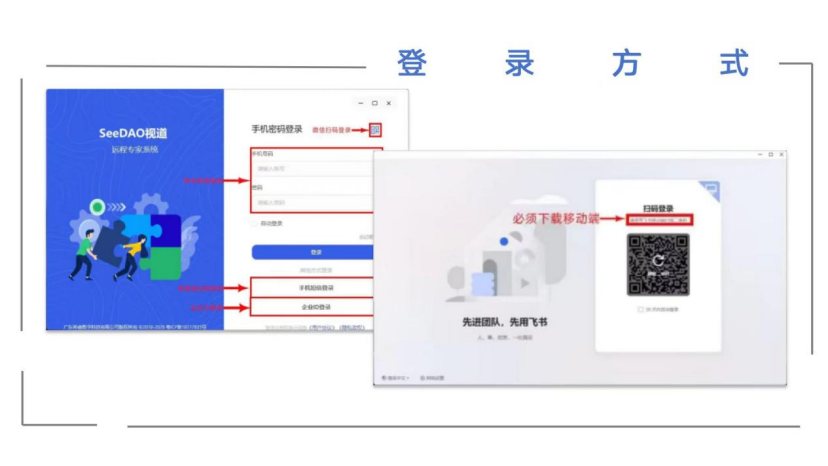 首先飞书在登录方式上十分不方便,必须通过下载手机客户端注册扫码才能登录。反观视道不仅支持微信扫码登录,还可通过账号密码登录、短信验证码登录以及企业ID登录,四种方式肯定有一种适合你!因此视道的登录方式更多样更方便用户使用体验。
