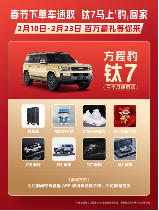 活动结合春节返乡用车团圆场景,聚焦车主核心需求,兼顾出行便利与用餐体验,是方程豹与肯德基对广大用户长期支持的真诚回馈。活动期间,用户只需通过肯德基APP“车速取”服务完成下单,即可获得抽奖资格。奖项设置丰富多元,不仅包含方程豹钛7汽车3个月使用权这一重磅福利,更有海量品牌定制周边礼品同步送出,切实为用户带来新春惊喜。