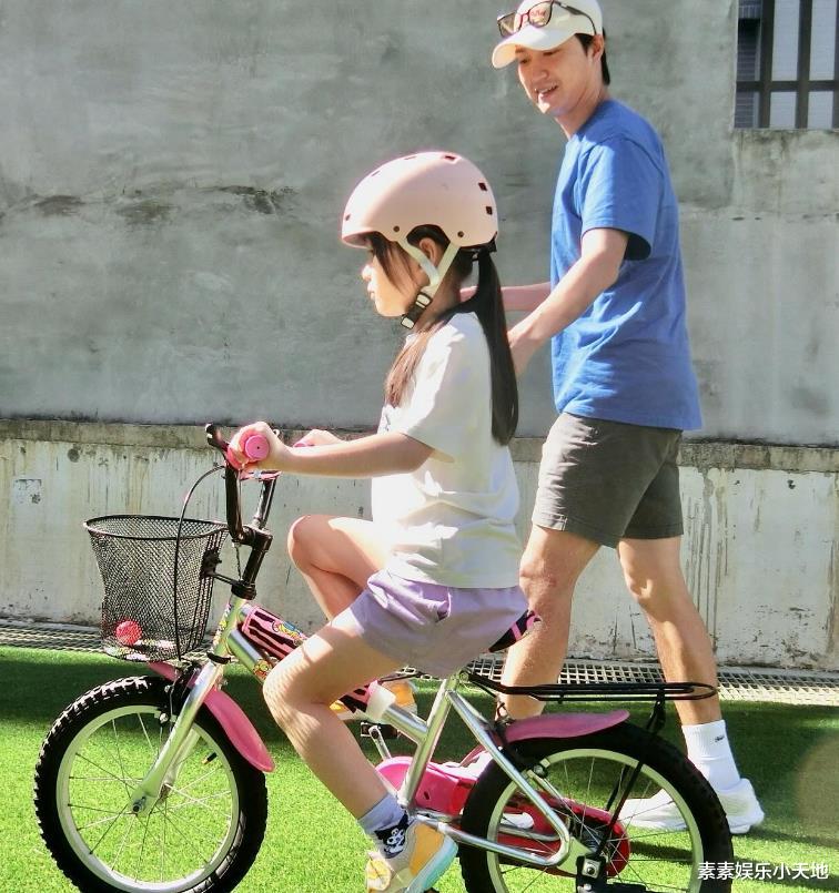 比如教女儿骑自行车的时候,他会贴心搀扶着女儿前行,小爱酱也是骑得非常放心。