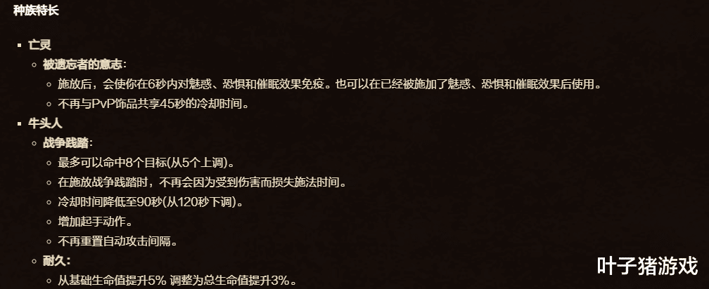 蓝贴里除了这两个职业改动以外,还对部落亡灵和牛头人种族进行了调整。亡灵意志获得史诗级加强,6秒对魅惑、恐惧和催眠效果免疫,而且不再与PVP饰品共享45秒CD,亡灵以后的定位就是为PVP而生。