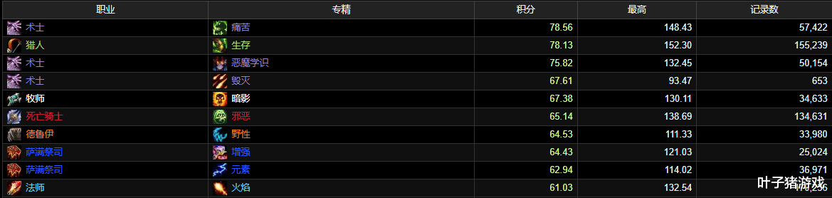 从MC首周的数据来看,DPS前五名分别是:痛苦术、生存猎、恶魔术、毁灭术和暗牧。单是术士就占3个坑,原来大家口中的百花齐放是指术士三个天赋,这么一说就懂了。但话又说回来,术士3系加起来却没有生存猎的多,所以第一周的霸主还得是猎人。