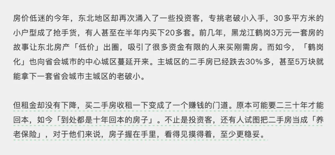 最近“人物”写了一篇文章,现在不少人去东北抄底老破小,一出手就是20套,因为现在东北到处都是“十年回本”的房子,20年后,成本收回,这20套老破小就是你白赚的,万一赶上拆迁啥的,你就赚大了。