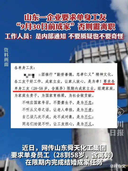 大家好,今天咱们得好好唠唠最近网上闹得沸沸扬扬的一件事。就在山东临沂沂南县,有个叫山东舜天化工集团的地方,他们工会出了个通知,让28岁到58岁的单身员工在9月30号之前必须成家立业。要是没做到,就得写检讨,甚至还得离职。这事儿一出来,网友们都炸开了锅。你说,这上班已经够累的了,每天还得被各种条条框框束缚着,现在连婚姻自由都要被限制了?这不是明摆着无视人权嘛!