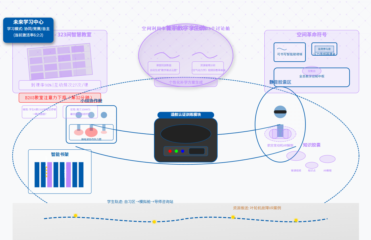 未来学习中心:智慧教学的物理载体为构建数智化的教学环境,北航完成了6400余平米的未来学习中心建设布局,通过对"线上+线下"学习空间的重构,打造集知识服务、学习支持、教学支持为一体的智慧学习空间,促进人机协同、时空融合,为全体学生提供泛在化、个性化、协作化的学习场景。