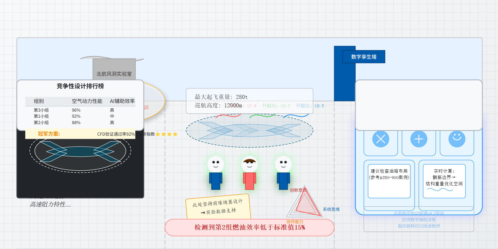 "师-生-机"三位一体的教学新模式在北航的航空航天专业课堂上,大模型已成为师生的重要助手。学生在设计飞机方案时,通过输入飞行器类型、载荷、速度等设计需求,AI大模型能快速生成初步设计方案,为学生提供专业级别的设计参考。学生石斌在采访中表示,AI能够发现设计中潜在的问题,帮助规避隐患,但具体设计过程仍需学生自己实施。这种"师-生-机"三方互动的教学模式,既发挥了AI在数据处理和方案生成方面的优势,又保留了教师在知识体系构建和价值引导方面的不可替代作用,同时充分调动了学生的主体性和创造性。