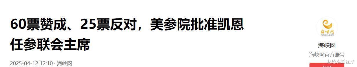美参院2025年4月12日以60票赞成、25票反对的结果,批准凯恩担任参联会主席。