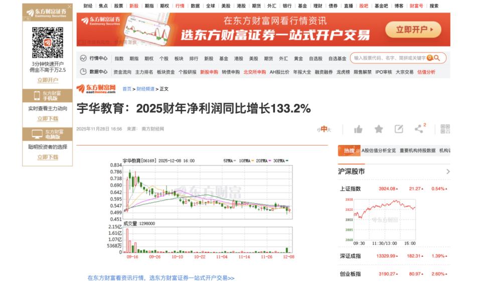 澎湃新闻《宇华教育今日复牌:2024财年净利润3.987亿元,同比减少64.86%》