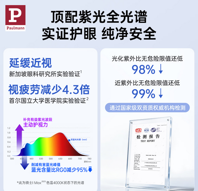 柏曼,在照明领域一直以独运匠心与卓越品质著称,旗下骑士IPro大路灯更是备受瞩目。第一,光源技术上,它采用了与普瑞齐名的首尔Sunlike紫光激发灯珠,它运用紫光激发方式,从源头保证了纯净安全,有害蓝光含量比RG0标准还要低95%,就像给眼睛加了一层温柔的保护罩。它还贴心补充了有益紫光波段,能提升主动护视力水平。