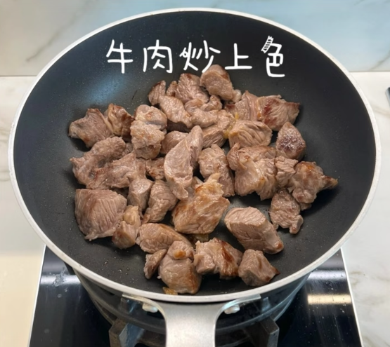 3. 热锅少油,放入冰糖小火炒至融化呈焦糖色,倒入牛腩块翻炒上色。
