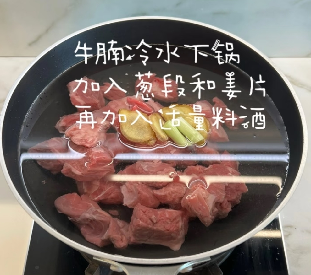 1.牛腩切块,冷水下锅,加入姜片和料酒焯水,捞出洗净沥干。