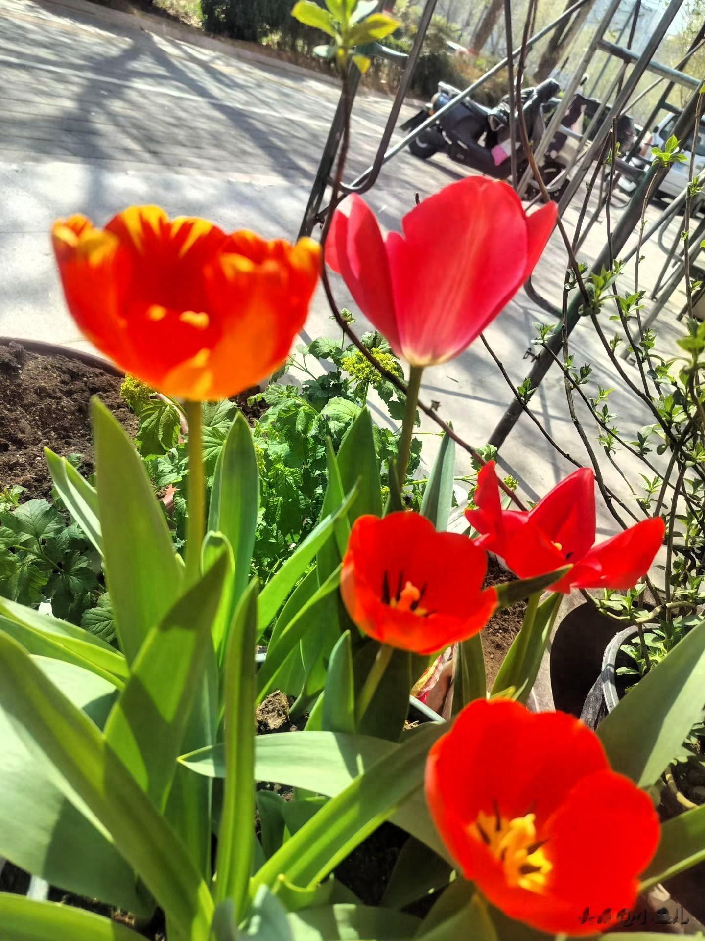 从埋球到开花,就盼着这一天。你看这红得多透亮,像小酒杯一样,迎着太阳开得热热闹闹的。还有这朵橙黄相间的,像被太阳染了色,太灵动了!