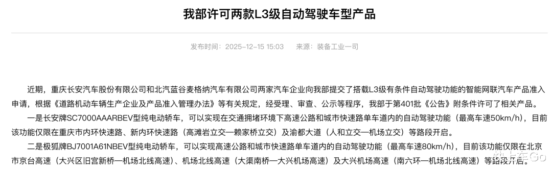自动驾驶的“解放双手”时代越来越近了,就在12月15日,工信部正式发了首批L3级有条件自动驾驶的“上路许可证”,其中长安深蓝SL03和极狐阿尔法S5两款纯电轿车率先拿到资格,将在北京、重庆划定的特定高速和快速路上,开始实实在在的试点运营。这标志着,咱们念叨了好几年的L3自动驾驶,终于从实验室和测试路段,正式迈向了商业化落地。