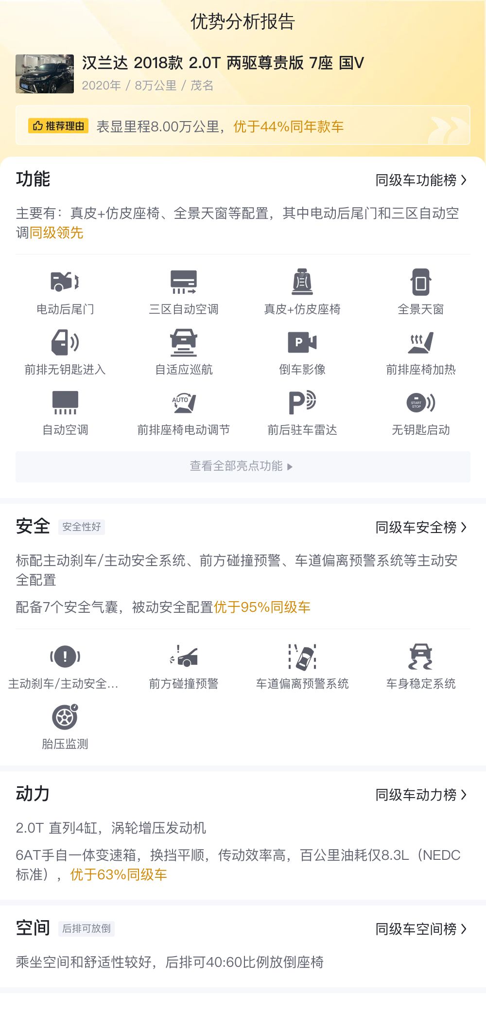 综上所述,汉兰达2018款2.0T两驱尊贵版7座国V凭借其出色的动力表现、宽敞舒适的内饰空间、丰富的配置以及较低的油耗,成为了一款性价比较高的二手车。然而,由于该车已行驶8万公里且有过一次过户记录,潜在买家在购买前应仔细检查车辆的实际状况,确保其符合个人需求和预算。同时,合理的用车习惯和定期的车辆保养也能够有效降低用车成本,让这辆汉兰达成为您家庭出行的得力伙伴。