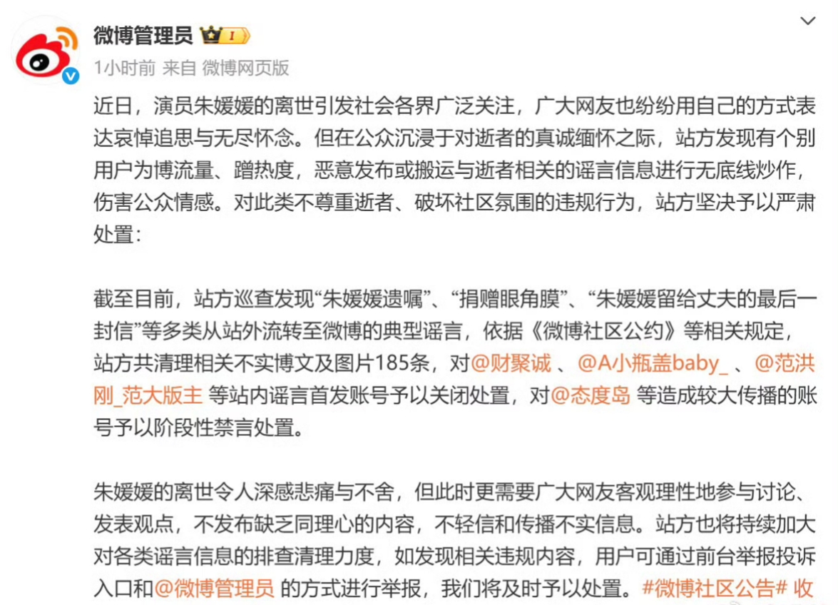 眼见谣言肆虐,微博平台终于亮剑!依据《社区公约》,185条充斥着虚假信息和伪造图片的博文被火速清理。始作俑者如@财聚诚、@A小瓶盖baby 等账号被直接“抬走”——永久关闭!传播广泛的@态度岛 等账号也被阶段性禁言,体验了一把“闭嘴套餐”。国家话剧院、新华社等权威机构更是火线辟谣:“纯属捏造!”这一波封号,封的是造谣者的财路,更是对网络坟头蹦迪的当头痛击!