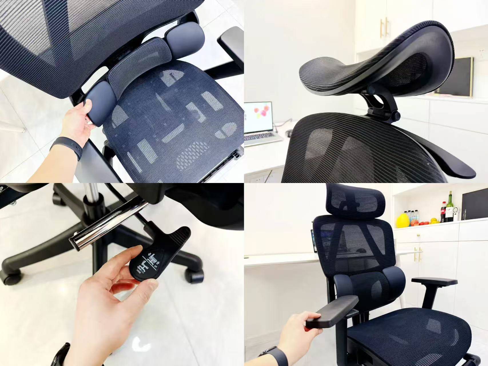 扶手支持多方向调节可以升降、前后移动、左右旋转,还能向上翻折。靠背可以后仰,最大角度约150度,支持四档角度锁定。头枕可以上下调