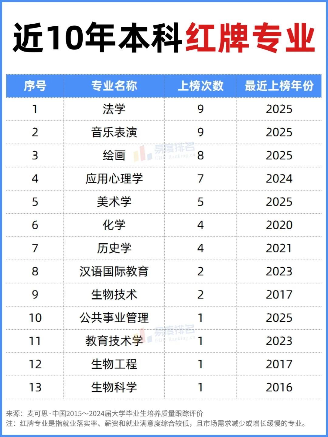 麦可思研究院最新发布的《2025年中国本科生就业报告》中,法学、音乐表演、绘画、应用心理学、美术学、化学、历史学、汉语国际教育、生物技术、公共事业管理、教育技术学、生物工程、生物科学被列为2025年本科就业红牌专业。
