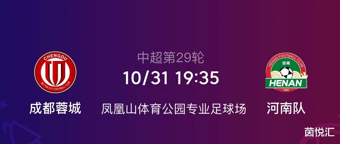 北京时间2025年10月31日19:35,2025赛季中超联赛第29轮继续进行,成都蓉城将坐镇主场凤凰山体育公园专业足球场迎战河南队,本场大战的结果将影响本赛季的联赛冠军最终归属,上轮错失反超上海海港良机的成都蓉城,面对无欲无求的河南队,能否一鼓作气拿下对手并将争冠悬念延续到最后一轮,值得关注。