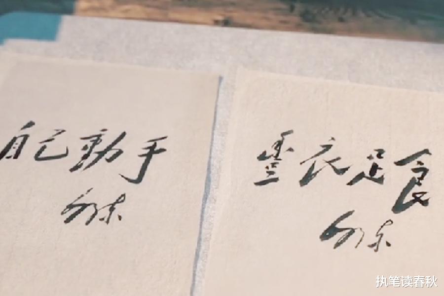 而毛主席正是这场生产自救最早的发起人,所以他把自己在几年前为延安边区生产自救提出的口号,通过书法艺术向银屏前的观众展示出来。