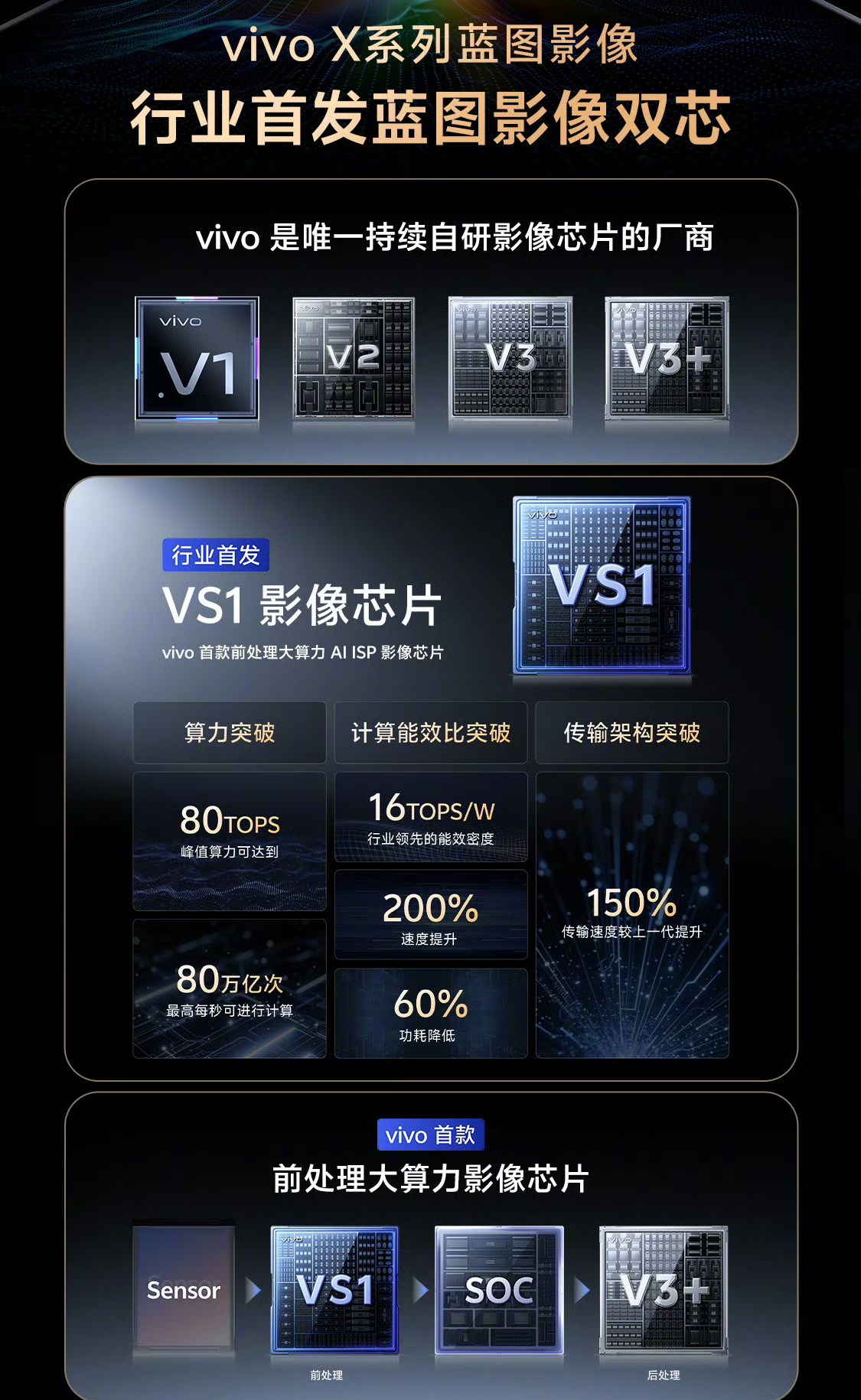 vivo X200 Ultra 此次最大的亮点,当属首发的蓝图影像双芯 ——VS1 与 V3+ 。作为 vivo 首款前处理大算力 AI ISP 影像芯片,VS1 可谓身怀绝技。它采用双核异构 NPU 架构,有着行业领先的 16TOPS/W 的能效密度,峰值算力高达 80TOPS,每秒能进行 80 万亿次计算。这意味着什么?影像处理速度提升 200%,功耗降低 60%,传输速度提升 150% !而 V3 + 芯片也不遑多让,二者相辅相成,为影像、影音播放及游戏等多场景带来持续的性能提升,同时达成性能与功耗的平衡。从此,移动影像首次具备 “预处理”+“后处理” 能力,照片的清晰度、色彩还原度等都将达到全新高度。