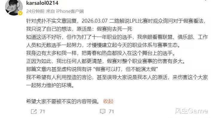 前LPL传奇打野Karsa,近日在直播的时候,也发表了一些,对于假赛的看法,他的原话是假赛G死一死,结果有人颠倒是非,把白的说成黑的,造谣咖哥在直播的时候说:假赛可以打但不能演太假,这一番话出来,引发了激烈的争议,不明所以的吃瓜群众们被带偏了,不少人开喷卡萨。