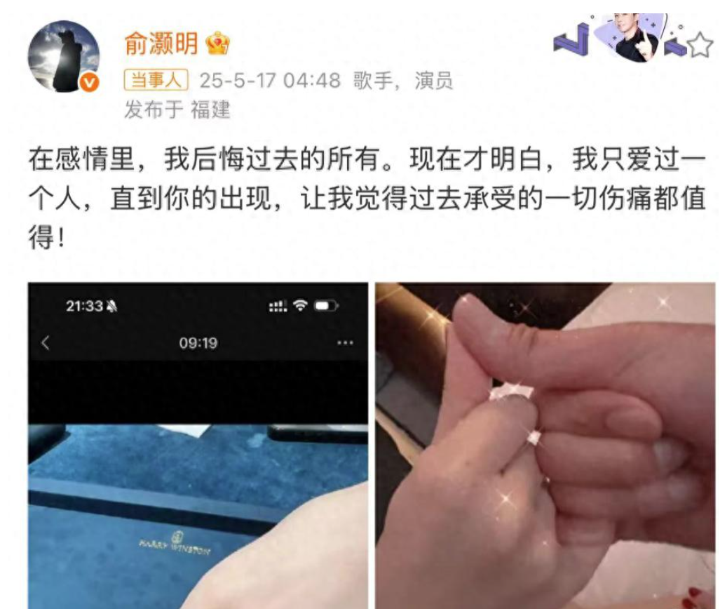 俞灏明的微博官宣更是戳中泪点。他写道:“在感情里,我后悔过去的所有。现在才明白,我只爱过一个人,直到你的出现,让我觉得过去承受的一切伤痛都值得。”这句话背后,是他对过往的释然,也是对未来的笃定。