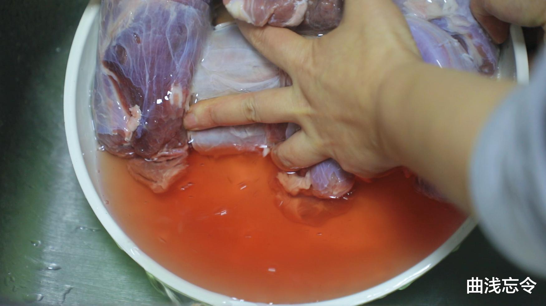 1、牛肉浸泡清洗:牛腱子(金钱腱)5斤,如果是冷冻品则提前拿出来室温化冻,每个从中间分切两段,清水浸泡1小时,充分浸泡除去血水,每20分钟换一次水,清洗干净备用。