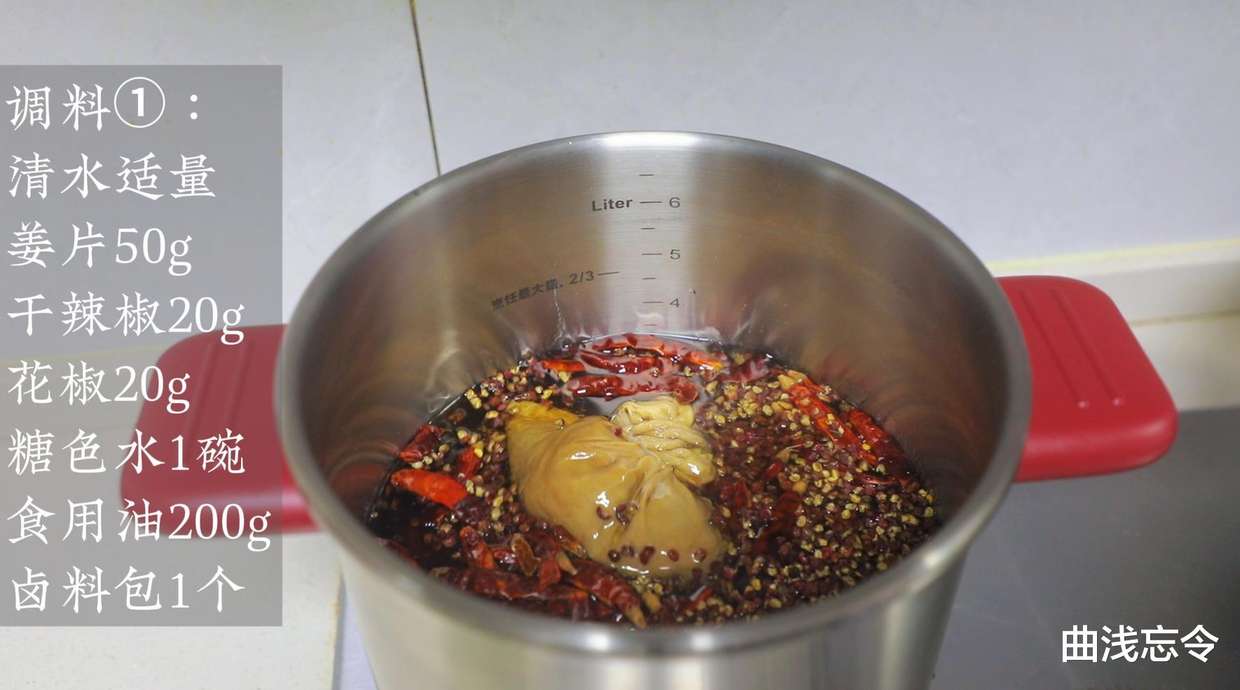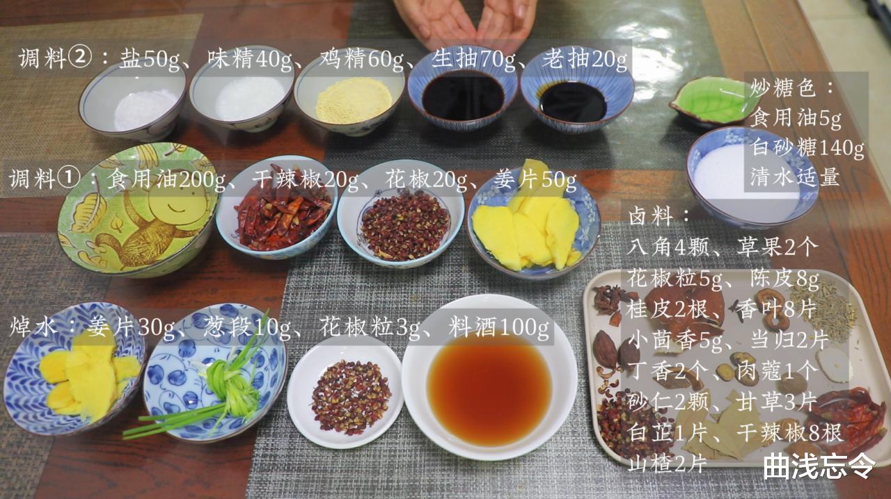 调料①熬香:清水适量、姜片50g、花椒20g、干辣椒20g、食用油200g、卤料包1个、糖色水1碗;